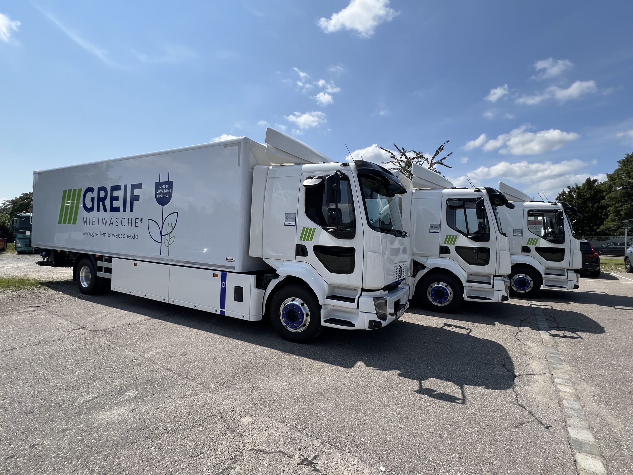 GREIF Mietwäsche nimmt gleich drei neue Elektro-Lkw in die Lkw-Flotte auf. Bei den E-LKW hat sich einiges getan und die neuen Modelle von Renault Trucks erreichen mit einer maximalen Reichweite von bis zu 560 km nahezu die doppelte Reichweite der Vorgänger. Dies stellt eine erhebliche Verbesserung dar. GREIF Mietwäsche investiert dabei bewusst in eine höherpreisige, aber nachhaltigere Technologie, um einen wichtigen Beitrag zum Umweltschutz zu leisten. Die drei neuen Fahrzeuge unterstreichen das generelle, umfassende Engagement von GREIF Mietwäsche für umweltfreundliche und innovative Logistiklösungen.